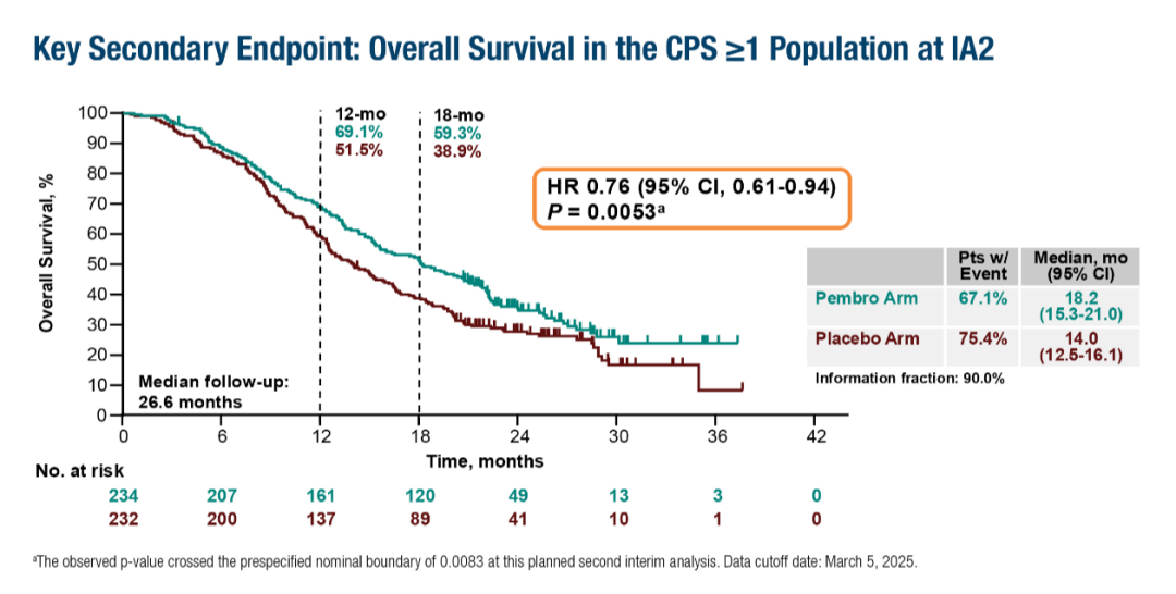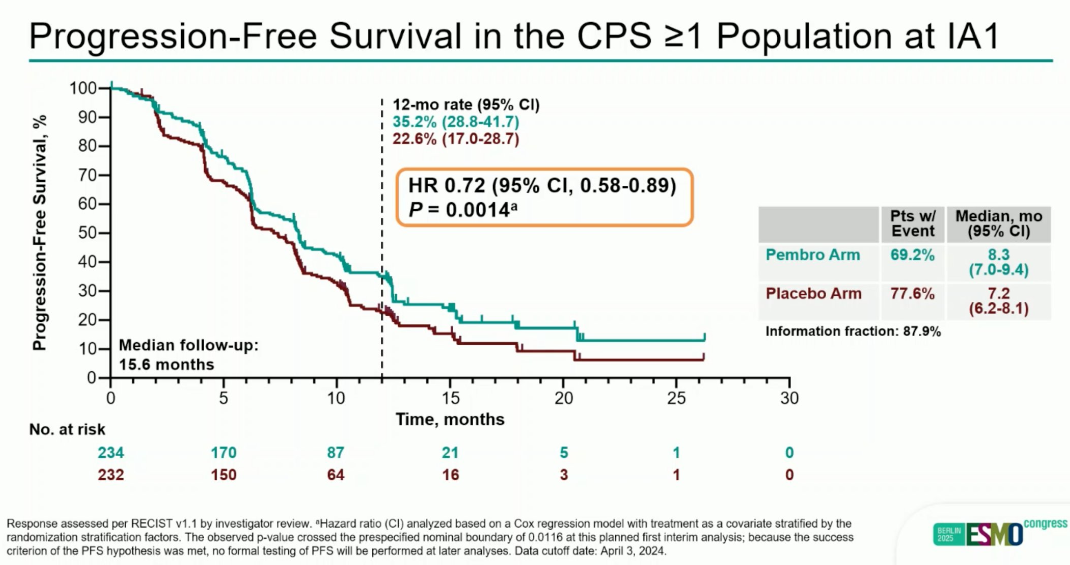 ☆在首次中期分析中,中位随访15.6个月。在非选择意向治疗(ITT)人群中,帕博利珠单抗组的中位PFS为8.3个月,而安慰剂组为6.4个月(风险比<hr/>=0.70;95%置信区间[CI]0.58–0.84;p<0.0001)。在PD-L1阳性肿瘤(PD-L1联合阳性评分[CPS]≥1)患者中,中位PFS分别为8.3个月vs.7.2个月(HR=0.72;95%CI 0.58–0.89;p=0.0014)。