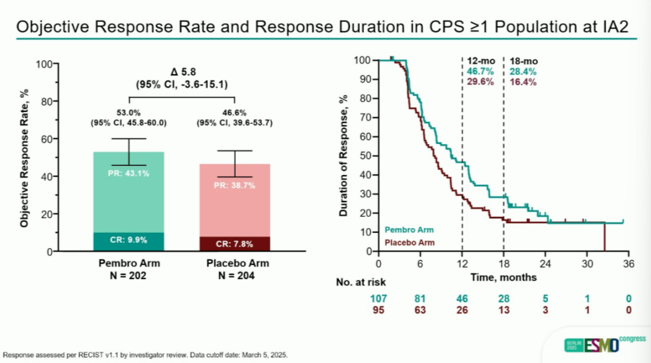 ☆ITT人群中,帕博利珠单抗组的客观缓解率(ORR)为50.4%,安慰剂组的ORR为40.8%。在CPS≥1人群,帕博利珠单抗组的ORR为53.0%,安慰剂组的ORR为46.6%。