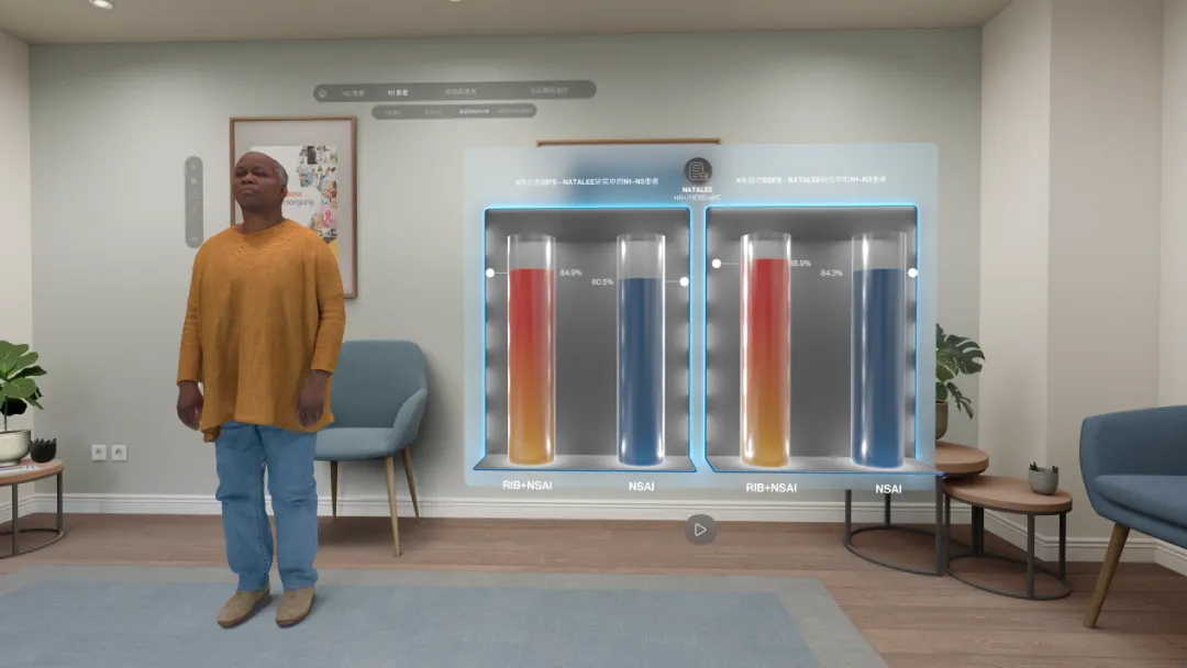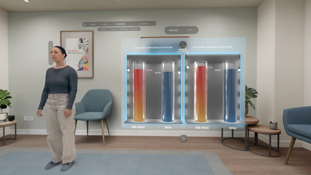 传统医学信息依赖二维图像与数值,而VR系统通过高精度构建肿瘤微环境,实现真正的三维可视化。医生可亲手抓取、旋转并剖析动态肿瘤模型,甚至在分子层面进行“精准切割”,直观观察瑞波西利等药物的作用机制。系统同步叠加复发风险与生存数据,将循证证据转化为可感知的视觉语言。