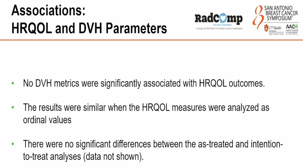 研究队列纳入RadComp试验中按方案完成治疗、具有完整心脏亚结构剂量体积数据、并在放疗前及放疗后6个月内至少完成一次心脏特异性HRQOL评估的局部晚期乳腺癌患者。心脏特异性HRQOL评估工具包括PROMIS疲劳量表、PRO-CTCAE呼吸困难以及PRO-CTCAE胸痛、胸部紧迫感和心绞痛。心脏亚结构剂量学分析包括全心、左心室、右心室、左心房、右心房及左前降支动脉。
