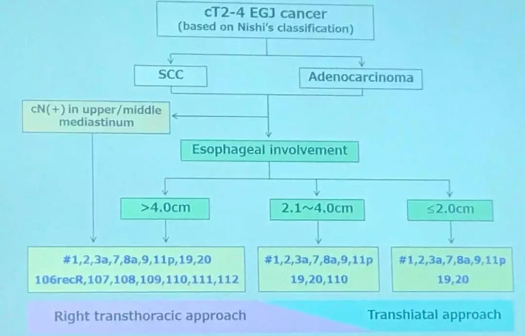 关于食管胃结合癌的淋巴结清扫范围,日本的Yukinori Kurokawa教授报道了多中心的临床研究结果,该研究纳入cT2 -4期食管胃结合部癌患者共363例,其中鳞状细胞癌31例,腺癌患者依据肿瘤侵犯食管的长度分为两组(食管侵犯长度≤3 cm和>3cm)。 手术方式见下面表格: