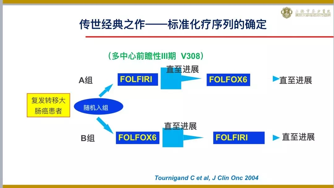 在2019年07月13日由解放军联勤保障部第九〇〇医院举办的第三届海峡肿瘤精准医学高峰论坛上,作为中国临床肿瘤学会理事长的李进教授做了精彩报告(图一),从前瞻性III期试验V308结果确立FOLFOX6和FOLFIRI互为一二线标准治疗的地位(图二),到贝伐珠单抗、西妥昔单抗、瑞戈非尼和伏喹替尼等靶向药物的临床应用,提高了晚期结肠癌患者最好的中位生存期达到3年以上,再一次阐述了晚期结肠癌全程规范诊疗的重要性。