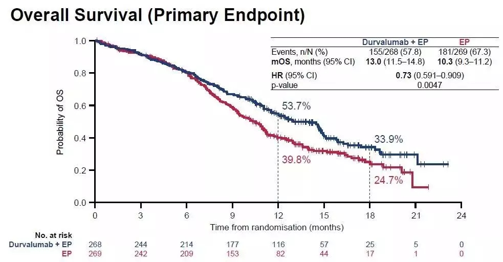 本次WCLC大会中,公布了PD-L1单抗Durvalumab在广泛期SCLC一线治疗的CASPIAN研究结果,研究分为三组:PD-L1(Durvalumab)+化疗(依托泊苷/铂类);化疗(依托泊苷/铂类);四药联合,即PD-L1(Durvalumab)+化疗(依托泊苷/铂类)+ CTLA4抑制剂(tremelimumab)