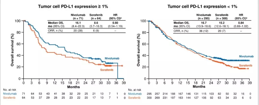 图3. 纳武利尤单抗和索拉非尼组治疗中不同PD-L1表达人群中OS变化