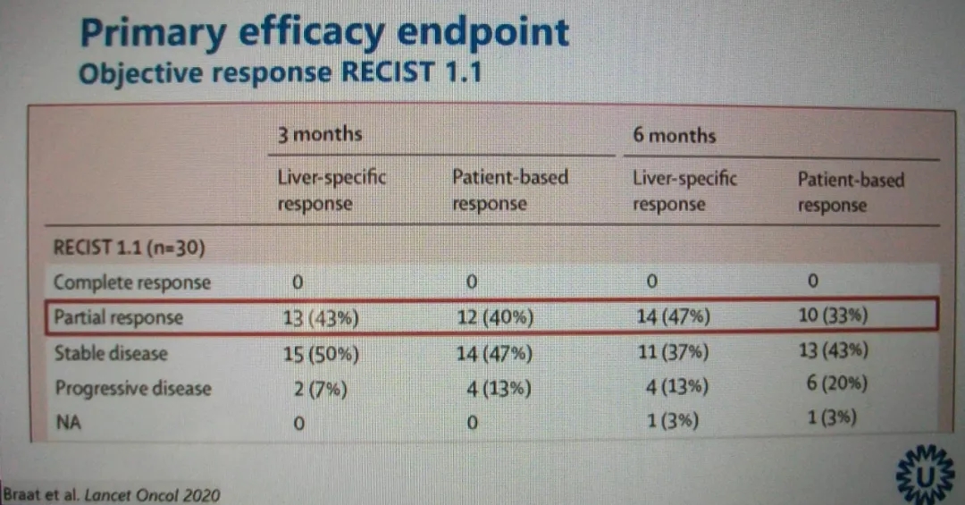 另外一项来自荷兰的口头汇报中,Arthor Braat教授介绍了联合应用PRRT+肝脏病灶放射性核素治疗肝转移NET患者的II 期研究(HEPAR PluS研究)。HEPAR PluS研究纳入30例具有>3个可测量残留肝转移病灶的G1或G2 NET患者,在PRRT治疗结束20周后,给予166 HO-RE治疗。从其初步结果来看,这种联合治疗的安全性和有效率都不错,166 HO-RE治疗3个月和6个月时,肝转移病灶的ORR分别为43%和47%,总体ORR分别为40%和33%(图4)。CTCAE(Common Terminology Criteria for Adverse Events) 3-4级毒性仅限于腹痛(10%)、恶心(3%)和疲乏(3%),研究过程中发生了1起与治疗相关的严重不良事件(3%),其为致命的放射性肝病。在治疗3个月时生活质量评估结果暂时性下降[5]。在其他讲者的内容以及POSTER中都提到了PRRT和其他治疗方式联合应用的安全性和有效性问题,研究显示在合适的情况下,不同联合应用方式的安全性是有保障的,同时能提高治疗的效果,为合理应用PRRT治疗提供了新的思路。