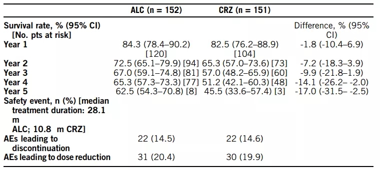 结果显示,阿来替尼组和克唑替尼组的中位随访时间分别为48.2个月和23.3个月,OS数据仍然不成熟。阿来替尼组的OS尚未达到,而克唑替尼组的OS为57.4个月。两组的5年OS率分别为62.5%和45.5%。基线有CNS转移患者,阿来替尼可将死亡风险降低42%,而基线无脑转移的患者,疾病死亡风险降低24%。所有亚组分析均显示了阿来替尼的获益。数据分析时,两组分别有35%和9%的患者仍然继续接受原治疗药物。安全性方面,阿来替尼和克唑替尼分别有14.5%和14.6%的患者因不良反应导致终止治疗;分别有20.4%和19.9%的患者因不良反应导致治疗剂量降低。