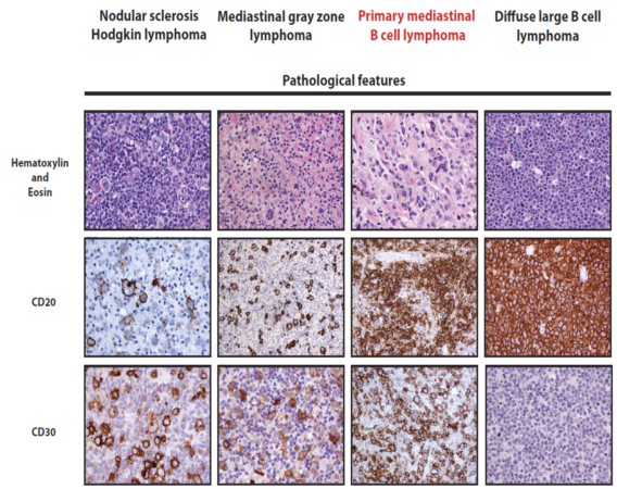 儿童原发纵膈的大B细胞淋巴瘤(PMBCL),约占非霍奇金淋巴瘤(NHL)的1%~2%。在免疫表型和分子生物学上都有一些自己的特点,但也具有弥漫大B细胞淋巴瘤(DLBCL)和经典型霍奇金淋巴瘤(CHL)的组织病理学特征,因此需要注意鉴别诊断。临床特点为:主要发生于胸腺,表现为纵膈肿块,肿块体积通常很大,常侵犯临近器官如肺、胸膜和心包,也可能侵犯锁骨上淋巴结和颈部淋巴结。临床症状主要表现为由纵隔肿块压迫引起的症状,如:上腔静脉压迫综合症等。肿瘤远处转移包括肾脏、肾上腺、肝脏或中枢神经系统,但通常无骨髓累及,其次B症状也可能出现。