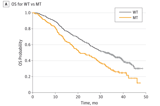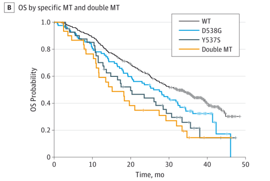 图2B:WT、仅D538G突变、仅Y537S突变和D538G和Y537S双突变(双MT)患者的OS结果