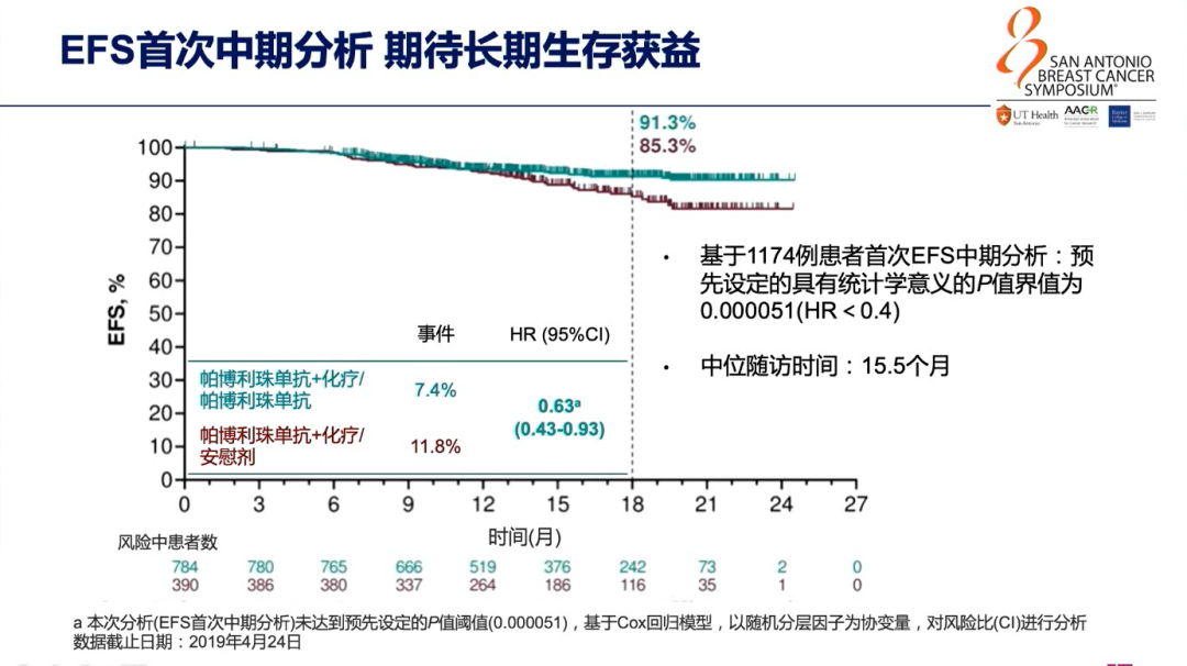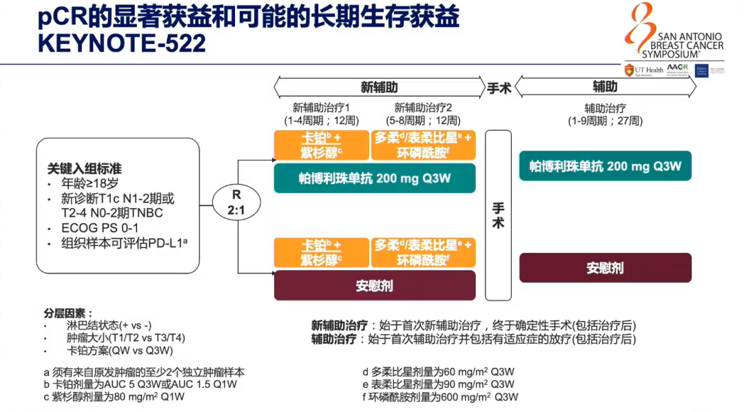 KEYNOTE-522研究是在早期TNBC新辅助治疗中应用帕博利珠单抗(Pembrolizumab)+化疗对比安慰剂+化疗后辅助治疗序贯帕博利珠单抗和安慰剂的Ⅲ期研究,入组患者为新诊断的T1c N1-2或T2-4 N0-2期、组织样本可供评估PD-L1检测的TNBC患者,主要研究终点是pCR(定义为ypT0/is ypN0)和无事件生存率(EFS)。基线人群中PD-L1阳性患者占到了81.6%和83.3%。该研究采用了目前TNBC最强的化疗方案(即卡铂+紫杉醇+多柔比星/表柔比星+环磷酰胺四药方案),分别配伍帕博利珠单抗或安慰剂。结果显示,帕博利珠单抗+化疗组pCR率显著高于安慰剂+化疗组(64.8% vs 51.2%,P=0.00055)。此外,研究者还发现无论PD-L1阳性/阴性患者都可以在新辅助治疗中有pCR的获益。EFS首次中期分析未能达到预先设定具有统计学意义p值的边界,但经过18个月的随访,IDFS绝对获益达到6%(91.3% vs 85.3%),虽然该研究数据尚未成熟,但是我们从中看到了获益趋势。