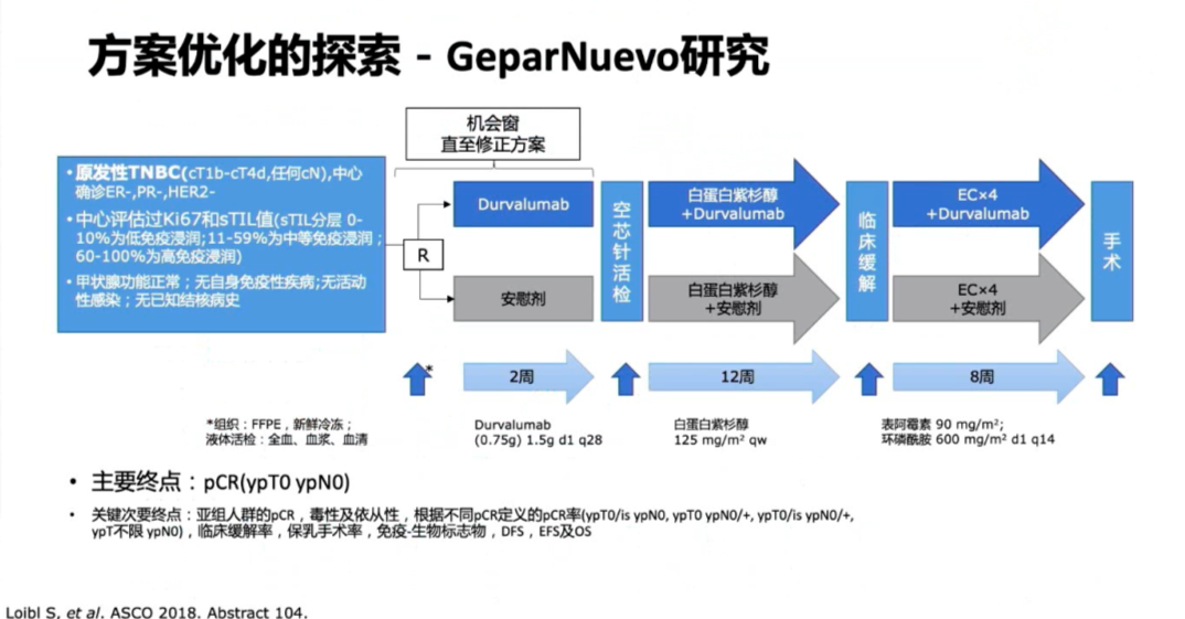 为探索何种配伍能够达到免疫治疗最好的疗效,研究者设计了GeparNuevo研究,该旨在探讨原发性TNBC(cT1b-cT4d,任何cN)患者中,紫杉序贯蒽环新辅助化疗的基础上联合抗PD-L1单抗Durvalumab的疗效。整体上患者pCR率没有显著差异(53.4% vs 44.2%,P=0.287),但预设的亚组分析,机会窗的患者(先在前2周接受Durvalumab或安慰剂单药治疗,然后进行空芯针活检并后续随机)与安慰剂相比,接受Durvalumab治疗的机会窗队列患者pCR率在数值上有明显提高(61.0% vs 41.4%,P=0.052)。该研究提示,未来可以选择化疗药物和免疫检查点抑制剂不同顺序的诱导治疗或选择不同化疗药物进行配伍的优化治疗方式。