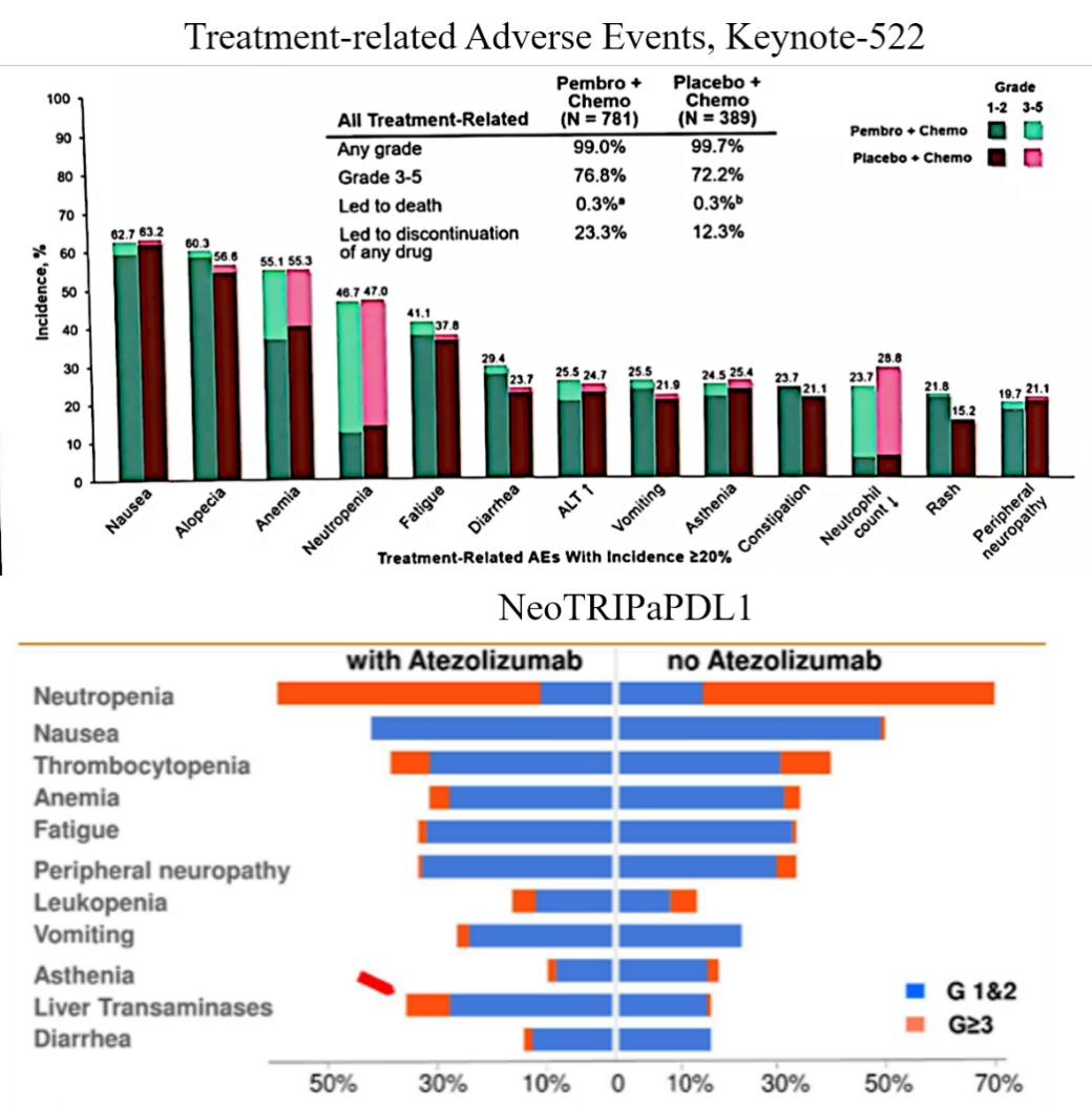 Keynote-522和NeoTRIPaPDL1研究方案均含有卡铂。铂类同为影响DNA化学结构的细胞毒药物,其在PD-1抑制剂Nivolumab应用后亦能增加CD8+T细胞等免疫细胞浸润、PD-L1表达以及dMMR的发生。但铂类最常见的不良反应之一为血液学毒性,卡铂引起粒细胞减少的发生率高达85%,贫血和血小板减少发生率分别为71.9%和62%。而以中性粒细胞为代表的三系细胞减少会通过周围循环系统降低机体固有免疫,影响肿瘤微环境的免疫水平。Keynote-522和NeoTRIPaPDL1研究中患者分别接受了4个和8个周期的卡铂治疗,治疗相关的血液毒性在NeoTRIPaPDL1中的发生率显著高于Keynote-522。是否多周期的卡铂应用导致血液毒性增加减弱了固有免疫水平,从而消弭了由卡铂本身介导的免疫诱导激活作用?在晚期TNBC的Keynote-355研究中,Pembrolizumab联合吉西他滨/卡铂并未提高PD-L1阳性亚组的PFS获益,铂类在免疫配伍中的作用仍待明确。