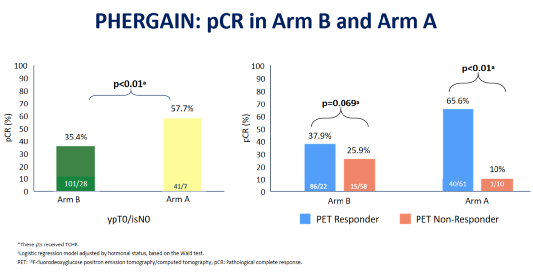 PHERGAIN在免化疗方向上继续进行了探索,旨在通过PET/CT对于初期应用化疗与否的病例进行分型,新辅助内分泌联合双靶向治疗的pCR可达35.4%。另一方面,PHERGAIN研究的结果证实,PET/CT对于应用TCHP的pCR率具有较好的早期预测作用,PET/CT有早期反应的患者pCR较无反应的pCR率高六倍以上。
