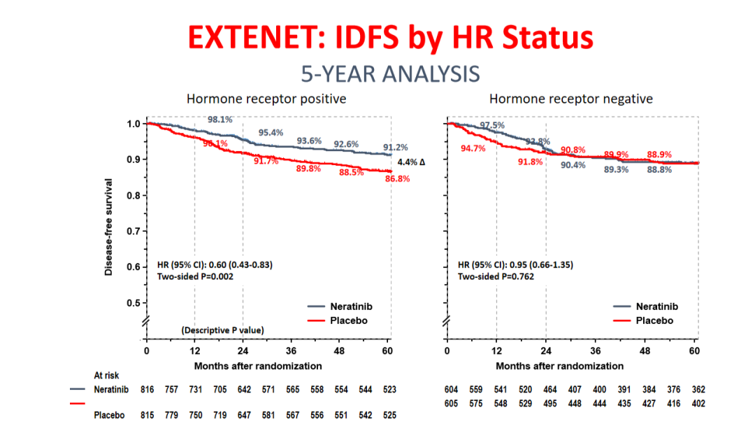同时,在新辅助治疗后使用TKI的价值也得到了广泛关注。EXTENET研究探索了新辅助治疗后使用奈拉替尼对于iDFS的影响。5年随访中,奈拉替尼对于HR+的患者产生了极大的iDFS获益,但对于HR-患者则无明显效果;针对新辅助治疗后non-pCR的HR+患者,奈拉替尼同样显著提高了iDFS。目前尚在进行的HR-BLTN-III-EBC研究进一步考察了新辅助治疗24周后non-pCR患者使用TKI的获益情况。