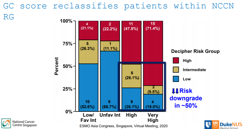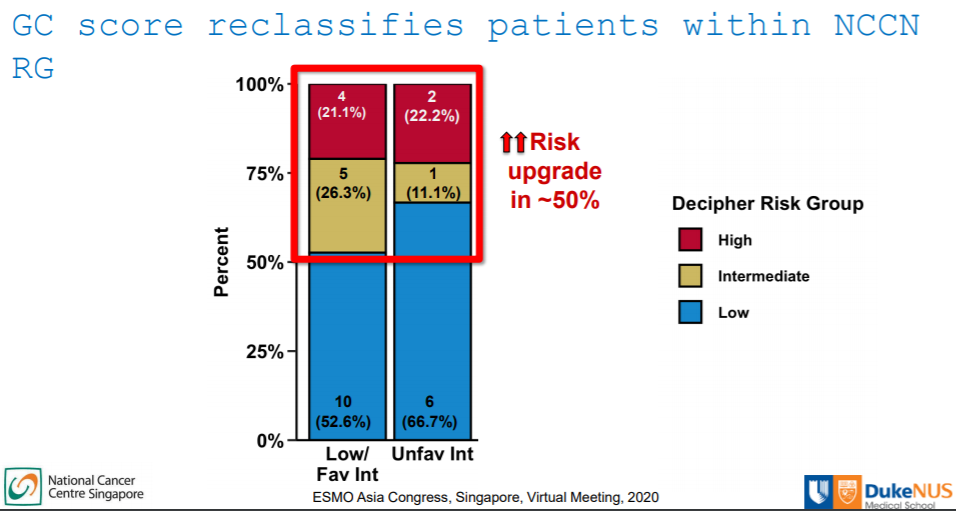由于疾病存在临床异质性,因此,中危和高危PCa在诊治过程中也具有一定挑战性。22-基因的基因组分类(GC)已被证明可以影响西方国家队列中白人和非白人男性PCa患者的治疗决策。本研究比较了东亚PCa队列中GC与NCCN的风险分层。