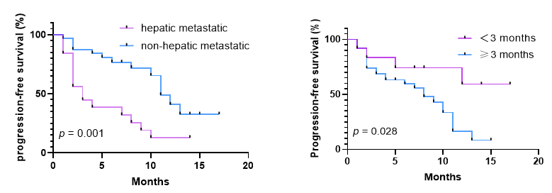 我们回顾性地分析了2018年5月至2020年1月接受哌柏西利联合内分泌治疗的激素受体阳性复发转移性乳腺癌患者的临床资料。51名接受哌柏西利的患者中,14名患者为一线治疗,37名患者为二线或后线治疗。总客观缓解率为10.6%(5/47,95%CI:3.5%~23.1%),总临床获益率为67.4% (29/43,95% CI:51.5%~80.9%)。中位无进展生存时间为10个月(95%CI:7~13)。本研究发现更好的临床结局与免疫组化(再)确认距离用药时间较近(<3months vs ≥3months,P=0.028;<6months vs ≥6months,P=0.046)、非肝转移(P=0.001)相关,但与ER/PR百分比、Ki-67指数、体重,及一/二线患者的前序化疗用药无关。