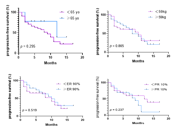 图2. 哌柏西利联合内分泌治疗的疗效与年龄、体重、ER/PR百分比无关