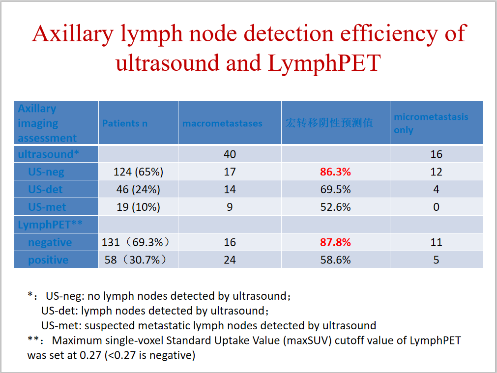 我们一共筛选了224例患者,最终成功入组的189例浸润性乳腺癌中,前哨宏转移为40例。和前期研究的数据非常的接近,临床体检的阴性预测值为78%,超声的阴性预测值为86.3%,而LymphPET(SUV 0.27作为界值)的阴性预测值为87.5。特别值得关注的是,如果将LymphET结合当前常规的临床腋窝评估方式(体检+超声),对于体检阴性超声阴性的患者,通过LymphPET可以进一步筛选出80%患者,其腋窝阴性预测值可以高达91%。(图3)