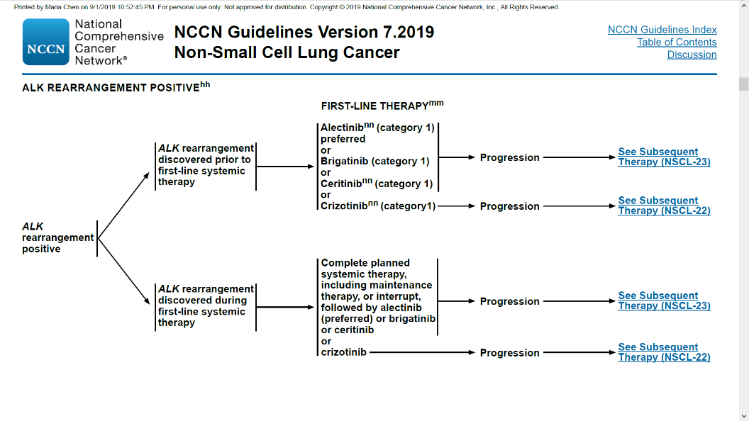 针对ALK通路目前已有一代克唑替尼、二代塞瑞替尼等多个药物选择。二代ALK-TKI最大的特点是靶点亲和性更好,可以穿透血脑屏障,对颅内病灶有效,并有预防脑转移的作用。包括NCCN指南在内多部指南均指出,不管ALK重排发现于全身治疗前还是治疗中,都可以选择ALK-TKI治疗。