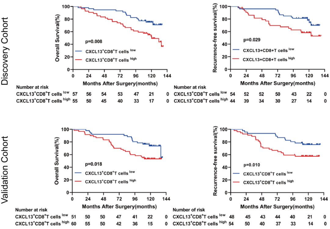 该研究聚焦于CXCL13+CD8+T细胞亚群在肾癌微环境中扮演的角色。通过对复旦大学附属中山医院新鲜肾癌手术切除样本进行流式分析,研究团队发现CXCL13+CD8+T细胞高表达“免疫刹车”检查点分子(PD-1、CTLA4、TIGIT和TIM-3),低表达效应性分子(IFN-γ、TNF-α),属于高耗竭性免疫细胞。通过对复旦大学附属中山医院肾癌手术治疗患者的组织芯片进行免疫组化双染,研究团队发现这样一群“叛变者”的高浸润与肿瘤进展密切相关,并预示更差的总体生存时间(p=0.008, OS)和无复发生存时间(p=0.029, RFS)。