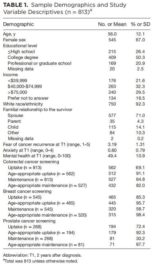 本次调查研究共分为两部分,即T1和T2。参与者在T1时自我报告他们的年龄、性别、教育水平、收入和种族/民族。这些人口统计数据作为协变量被包括在统计分析中,因为它们与癌症筛查行为有关。共有1635名照护人员(应答率,61.7%)在幸存者癌症诊断后平均2.1年内(T1)(SD,0.5年)完成了初始调查。在这些患者中,813名照护人员在患者首次诊断出癌症后的8年内(T2)完成了随访调查(67%为女性,平均年龄为56岁,92%是非西班牙裔白人)。与未完成者相比,完成T2调查的参与者年龄更大,FCR更高,非西班牙裔白人参与者更有可能完成T2调查(P<0.05)。完成者和未完成者在其他研究变量上没有差异(P>0.15)。