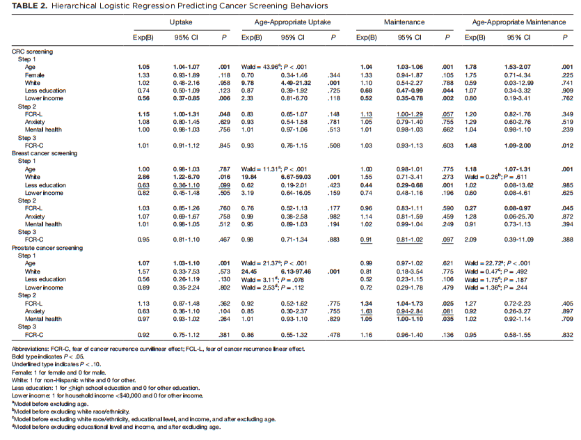研究者首先评估了FCR与结直肠癌、乳腺癌和前列腺癌筛查行为的线性关系。并假设较高的FCR与以下因素有关: