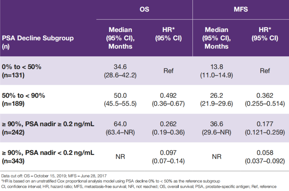 近期的一些PROSPER研究事后分析显示,PSA降幅越大的患者MFS越长(Hussain等,2020年ESMO),而与无PSA进展人群相比,轻度PSA进展患者的转移风险增加(Saad等,《欧洲泌尿外科杂志》,2020年)。Hussain教授在本次ASCO-GU大会上进一步探讨了PSA动态变化与患者预后之间的关系[2]。