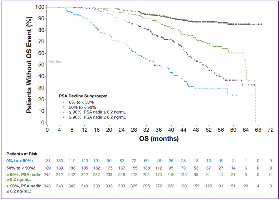 PROSPER研究的另一项事后分析则探讨了在恩扎卢胺治疗nmCRPC患者的过程中,PSA下降幅度与患者预后的关系,该结果与Hussain既往的事后分析也是一致的。整体上,PSA下降幅度越大,患者的OS和MFS则越长,PSA下降最低值<0.2 ng/mL的患者临床获益尤其显著。这一分析结果提示:PSADT小于10个月的nmCRPC仍然具有对抗雄药物敏感性的异质性,临床医生在治疗过程中可以通过PSA的监测来预测和评估患者肿瘤对治疗药物的反应,对于PSA下降程度不足的患者,也许需要调整治疗方案实现MFS的进一步延长。