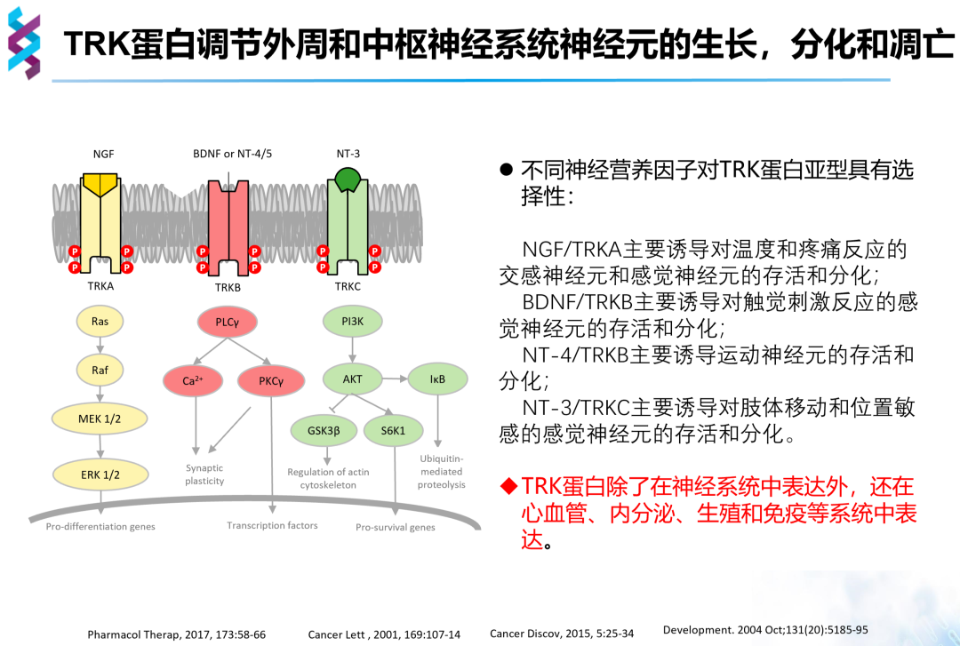 NTRK基因的三种亚型分别位于三种不同的染色体上,分别编码三种TRK蛋白。TRK蛋白是一种受体酪氨酸激酶,包含膜外受体结合区、跨膜区和细胞内激酶区,在与配体结合后发生二聚体化,使胞内酪氨酸激酶磷酸化并激活。不同的TRK蛋白具有不同的神经营养因子配体,激活不同的信号通路,其中TRKA主要激活Ras-MEK-ERK通路、TRKB主要激活PLC信号通路、TRKC主要激活PI3K-AKT信号通路,进而实现调节神经元的生长、分化和凋亡。