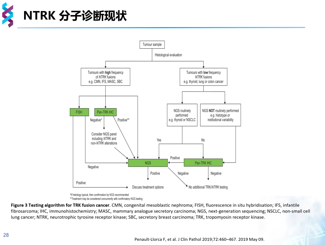 2019年ESMO指南也作了类似的策略推荐,在组织形态学分析后,NTRK融合高频肿瘤可选择FISH、RT-PCR和NGS检测;NTRK融合低频肿瘤优先选择NGS检测,在NGS不可及的情况下方考虑IHC等手段初筛。