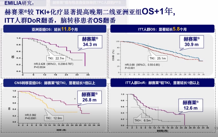 提及T-DM1的治疗效果,她总结道,T-DM1为晚期患者带来了延长生存的希望,是曲妥珠单抗经治后的首选方案。对于三线以上HER2阳性乳腺癌患者的治疗,TH3RESA研究提示,T-DM1与医生选择的方案相比,ITT人群PFS延长了2.9个月,亚洲组人群OS延长了6.9个月。在HER2阳性晚期乳腺癌患者的二线治疗中,EMILIA研究结果显示,T-DM1对比卡培他滨+拉帕替尼,ITT人群OS显著延长了5.8个月,亚洲组人群OS为11.8个月,CNS转移亚组OS延长更为明显。基于该研究的优效结果,T-DM1获批用于治疗既往接受曲妥珠单抗+紫杉烷治疗的HER2阳性转移性乳腺癌,成为了二线治疗的标准选择。