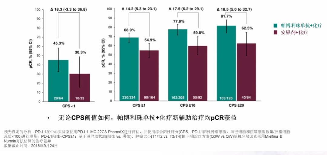 KEYNOTE 522研究旨在评估新辅助帕博利珠单抗+化疗对比安慰剂+化疗用于序贯辅助帕博利珠单抗或化疗用于早期三阴性乳腺癌的疗效和安全性。研究结果显示,帕博利珠单抗+化疗组与安慰剂+化疗组相比,pCR绝对值提高了13.6%[64.8%(95%CI:59.9~69.5) vs. 51.2% (95%CI:44.1~58.3),P=0.00055]。进一步分析结果表明,随着CPS评分的增加,患者获益也更加明显。无论CPS阈值如何,帕博利珠单抗+化疗新辅助治疗均有pCR获益。