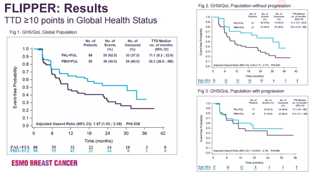 在前22个周期中,问卷调查的完成率很高(>95%)。各组间基线水平GHS/QoL的总体变化有显著性差异,食欲减退,便秘和全身治疗副作用评分有利于FUL/PBO组。在其余功能和症状量表上,两组间没有发现其他统计学上的显著差异。FUL / PBO组相较于FUL /PAL组的GHS/QoL中位TTD有所延迟[30.3个月vs. 11.1个月,校正后的HR(aHR)=1.57,95%CI:1.03~2.39,P=0.036];在PBO治疗无进展性疾病(PD)的患者中,GHS/QoL TTD有所延迟(aHR=2.0,95%CI:1.1~3.8,P=0.023),但在PD患者中没有影响(aHR=1.2,95%CI:0.6~2.2,P=0.658)。对于QLQ-C30和QLQ-BR23量表,TTD在统计学上没有显著差异。