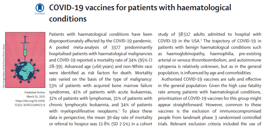 已批准的COVID-19疫苗对普通人是安全有效的。考虑到血液病患者的高致死率,COVID-19疫苗应优先应用于这类患者。然而,这些疫苗的3期随机对照试验都将免疫功能低下患者排除了。相关排除标准包括:应用免疫抑制剂或免疫调节剂,免疫球蛋白或血制品,无脾,及自免性疾病如免疫性血小板减少性紫癜。因此,这些试验结果可能对大多数血液病患者而言并不适用。COVID-19疫苗应在这类患者中进行严谨研究,筛选出能对感染COVID-19和非COVID-19疫苗产生免疫应答的有用数据,以帮助临床实践和预估。