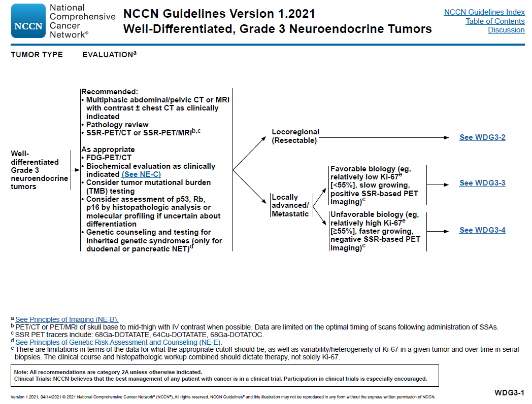 2021年第一版NCCN指南最大的亮点在于新增了2部分内容:一部分是“分化好的G3 NET临床管理流程”,一部分是“遗传风险评估及咨询原则”。具体如下: