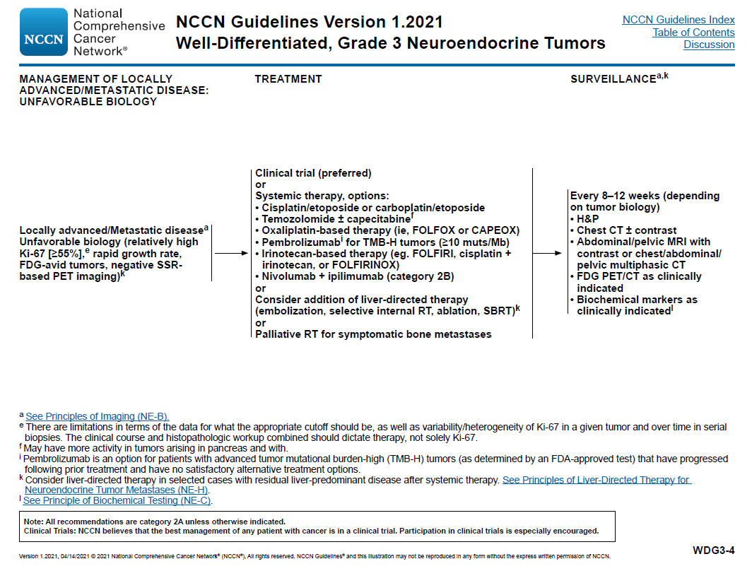 ● 如果其生物学行为不良(如:相对高的Ki-67指数[≥55%],快速生长,SSR-PET功能影像阴性),则可考虑进入临床试验(优选),或行肿瘤切除+局部淋巴结切除术(如可行),或根据个体情况行新辅助化疗后再行肿瘤切除+局部淋巴结切除术。可选的新辅助化疗方案有:替莫唑胺±卡培他滨;奥沙利铂为主的化疗方案(FOLFOX,CAPEOX);顺铂/依托泊苷或卡铂/依托泊苷。