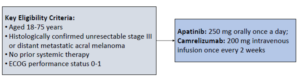 本研究为北京大学肿瘤医院郭军教授牵头的单中心、单臂II期临床研究(图1),纳入不可切除III期或IV期一线治疗的肢端黑色素患者,给予阿帕替尼250mg口服每天一次联合卡瑞利珠单抗200mg静脉注射每2周一次,4周为一个周期,至疾病进展或不良反应不能耐受。研究的主要终点为ORR,次要终点为PFS、DCR、2年生存率及安全性。
