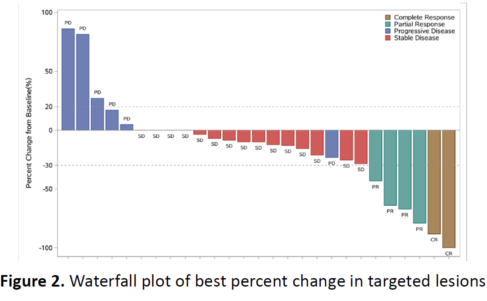 2019年4月至2021年1月,共入组肢端黑色素瘤患者30例。中位年龄为56.7(29-74),男女比例为8:7,8例为不可切除III期患者,22例IV黑色素瘤患者,中位肿瘤直径为45 mm(10-187mm)。截至2021年1月,中位随访时间8.3个月,27例患者可评估(图2),2例患者达到CR,4例患者达到PR,ORR为22.2%,DCR为77.8%,中位PFS为8个月,总生存(OS)数据仍在随访中。