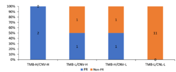 单因素分析可见LDH正常患者预后更佳,肿瘤分期、溃疡状态、基因突变类型与预后无明显相关。基线组织的全外显子测序数据显示(n=18),高拷贝数变异(CNV)及高肿瘤突变负荷(TMB)与疗效呈正相关(图3)。存在MDC1基因突变可能为疗效预测指标,4例突变患者均出现肿瘤缩小,其中2例PR。