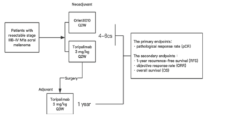 肢端黑色素瘤是亚洲人群高发的黑色素瘤亚型,相比欧美人群多发的皮肤型黑色素瘤,其生物学特性上存在很大的差异,治疗反应也十分迥异。对于晚期肢端黑色素瘤,PD-1单抗单药治疗有效率明显低于皮肤型黑色素瘤。PD-1单抗新辅助治疗于皮肤黑色素瘤的临床试验疗效卓越,使得黑色素瘤的治疗开启了新辅助治疗的篇章,但受其单药在肢端黑色素瘤中的疗效数据影响,单药免疫新辅助治疗难以使得高危肢端黑色素瘤患者获益。