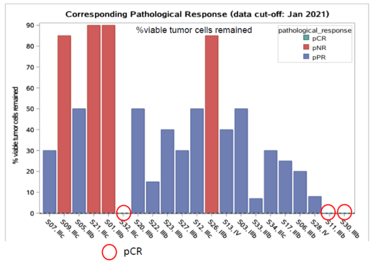 2019年7至2021年1月,共入组30例患者,中位年龄为56.5 (21-72)岁,19例男性(63.3%),其中IIIB期患者12例,IIIC期患者14例,IV期(M1a)4例,中位肿瘤直径为28 mm(10-80mm)。截止2021年1月,24例患者完成新辅助治疗,21例患者在接受新辅助治疗后接受手术,6例患者仍在新辅助治疗期。在接受手术的21例患者中,经病理学确认的pCR为3例(14%),pPR为14例(67%),病理缓解率高达81%。影像学评估结果:CR 1例、PR 7例、SD 8例,总影像学ORR为33%。目前生存数据尚未成熟,仍在随访中。