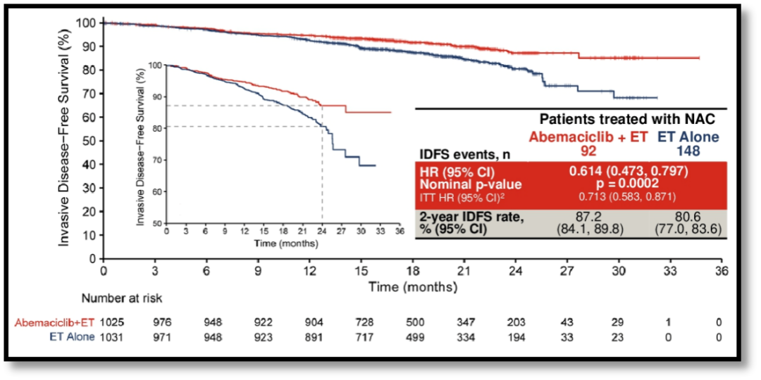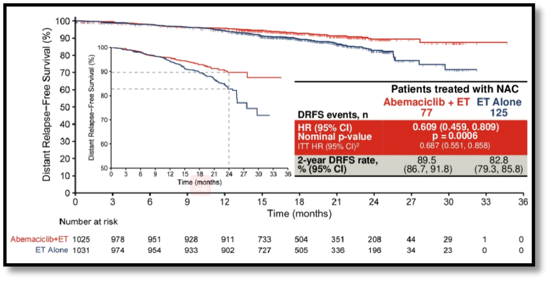 IDFS结果显示P=0.0002,HR(95%CI):0.614(0.473,0.797),其中HR比ITT人群更小。Abemaciclib+ ET组的2年IDFS率为87.2%,单用ET组为80.6%,绝对值差异为 6.6%,比ITT人群的3%更大。DRFS结果显示P=0.0006,HR(95%CI):0.609(0.459,0.809),其中HR比ITT人群更小。Abemaciclib+ ET组的2年DRFS率为89.5%,ET组为82.8%,绝对值差异为6.7%,比ITT人群的3%更大。绝对值差异达6%以上可以说是一个很大的突破,提示在接受NAC的患者中,Abemaciclib+ ET在IDFS和DRFS方面可能较ITT人群具有更优的临床意义的治疗获益。