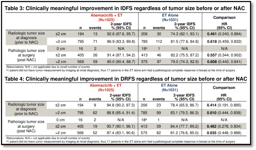 进一步分析显示无论NAC前后的肿瘤大小(以2cm为界值),IDFS和DRFS均出现具有临床意义的改善,提示与NAC前后的肿瘤大小无关(≤2 cm vs >2 cm),Abemaciclib+ET均降低了既往接受NAC患者发生IDFS事件或DRFS事件的风险。