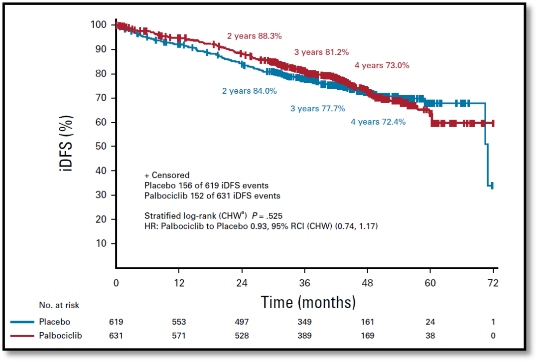 安全性数据与总体安全性人群相似,其中最常见的不良事件是腹泻(联合组:任何级别82.5%,3级8.2%,4级0%,5级0.1%),与阿贝西利的已知特征一致。PENELOPE-B是一项接受NAC治疗后的辅助ET联合Palbociclib的3期研究(J Clin Oncol, 2021, 39:1518-1530.)。该研究纳入HR+HER2-早期乳腺癌完成NAC后行手术治疗non-pCR且CPS-EG评分≥3或2且ypN+患者。入组后接受Palbociclib(1年治疗)+ET或ET,主要研究终点为iDFS。随访42.8个月,结果显示未达到主要研究终点,P=0.525,HR(95%RCI):0.93(0.74,1.17)。2年的iDFS率在Abemaciclib+ET组为88.3%,在单用ET组为84%,绝对值差异为4.3%,低于monarchE研究中接受NAC亚组2年IDFS率绝对差异6.6%,提示Abemaciclib在这一高危人群中有更好的获益可能,但仍需要进一步随机对照研究验证。