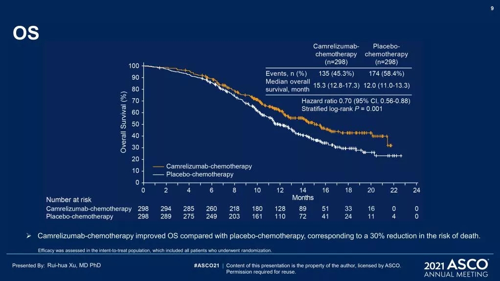 结果:从2018年12月3日至2020年5月12日,596例患者被随机分组。298例接受卡瑞利珠单抗联合化疗,297例接受安慰剂联合化疗。中位随访10.8个月,与安慰剂联合化疗相比,卡瑞利珠单抗联合化疗显著改善OS(中位15.3个月[95%CI:12.8~17.3] vs. 12.0个月[11.0~13.3];HR 0.70 [95%CI:0.56~0.88];单侧P=0.0010)和PFS(根据IRC)(中位,6.9个月[95%CI:5.8~7.4] vs. 5.6个月[95%CI:5.5~5.7];HR 0.56 [95%CI:0.46~0.68];P<0.0001)(图1,图2)。经研究者评估的ORR在卡瑞利珠单抗联合化疗组为72.1%,在安慰剂联合化疗组为62.1%,中位DoR为7.0个月 vs. 4.6个月。两组间≥3级治疗相关AEs的发生率相当(63.4% vs. 67.7%),其中最常见的是中性粒细胞计数下降(39.9% vs. 43.4%)。严重的治疗相关不良事件分别发生在30.2% vs. 23.2%的患者,治疗相关死亡分别发生在3.0% vs. 3.7%的患者。
