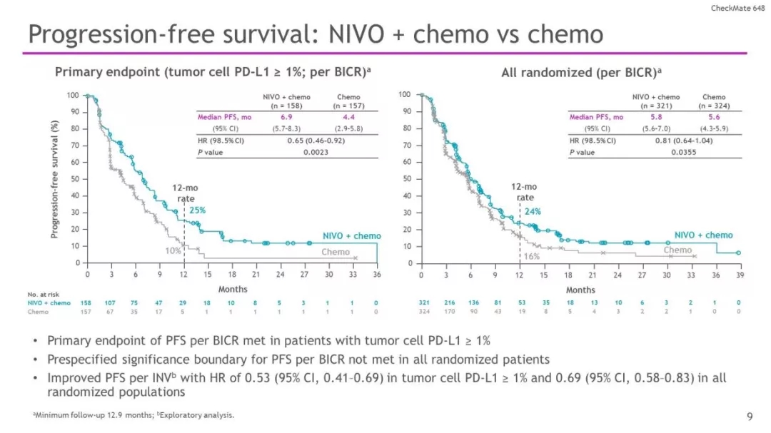 方法:无论肿瘤细胞PD-L1表达如何,既往未经治疗、不可切除的晚期、复发或转移性ESCC成年患者被纳入研究。患者随机分为NIVO(240mg Q2W) +化疗(氟尿嘧啶+顺铂Q4W)、NIVO(3 mg /kg Q2W)+ 伊匹木单抗(IPI)(1 mg /kg Q6W)或单独化疗。两两比较的主要终点均为经盲法独立中心审查(BICR)的肿瘤细胞PD-L1≥1%患者的OS和PFS。分级检验的次要终点包括所有随机患者的OS和PFS。