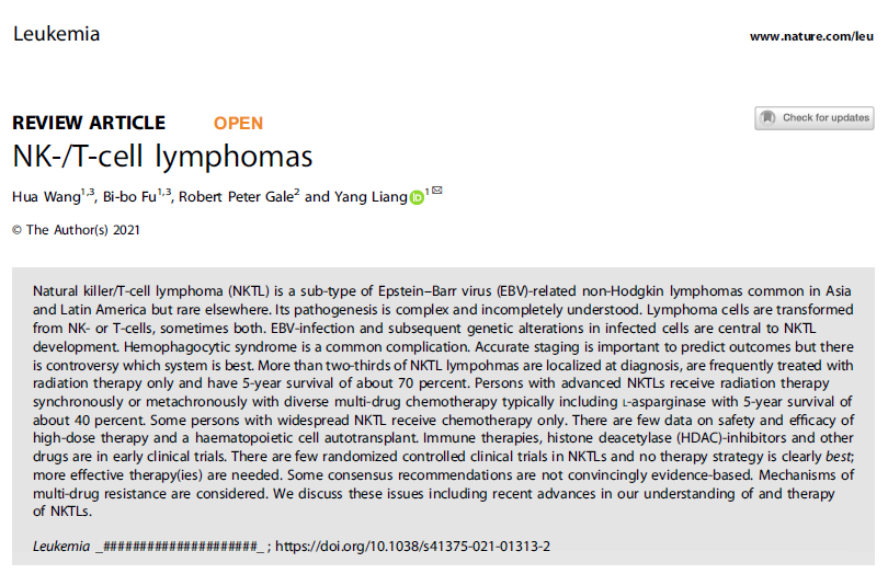 梁洋教授团队在Leukemia发表综述性文章,分享NK/T细胞淋巴瘤中国经验