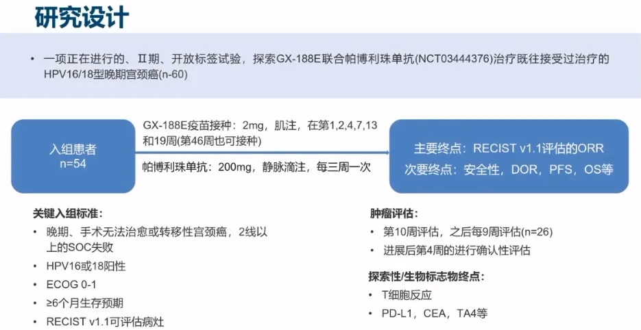 这项试验招募了54例HPV-16或HPV-18阳性的晚期、手术无法治愈或转移性宫颈癌患者,这些患者标准护理治疗后取得进展。研究评估了GX-188E联合帕博利珠单抗的疗效和安全性。