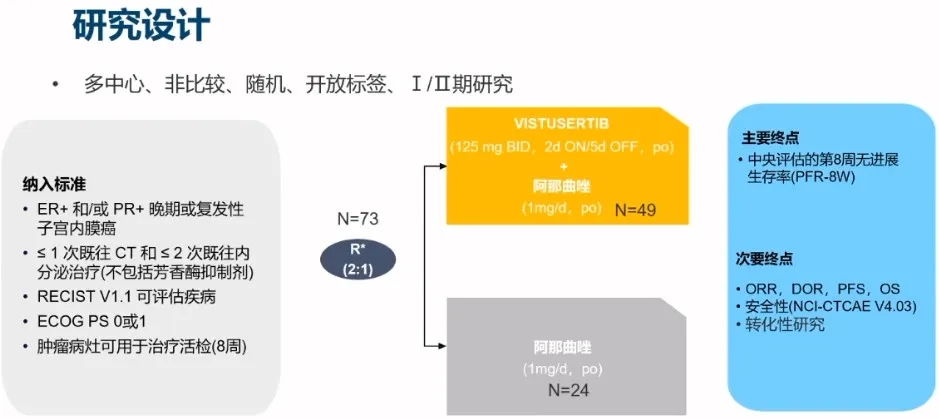 研究纳入73例ER+和/或PR+晚期或复发性子宫内膜癌患者,接受过≤1次既往化疗和≤2次既往内分泌治疗(不包括AI)。患者2:1随访分组接受VISTUSERTIB+阿那曲唑治疗或单用阿那曲唑治疗。