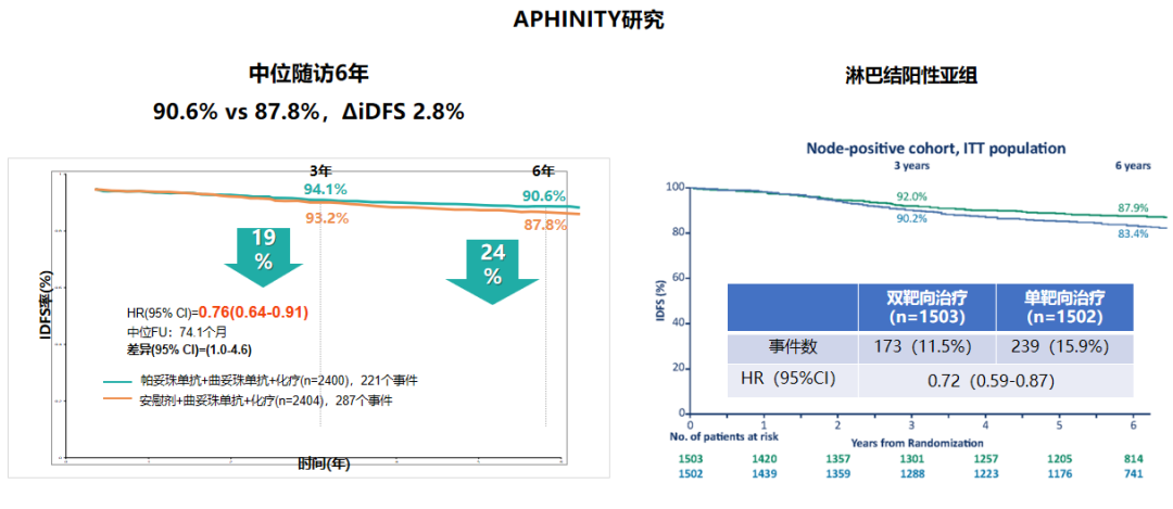 APHINITY研究对曲帕双靶在辅助治疗中的地位进行了探索,两组患者分别给予化疗+曲妥珠单抗+帕妥珠单抗 vs. 化疗+曲妥珠单抗+安慰剂方案,以探索HER2阳性早期乳腺癌患者辅助治疗的疗效差异。经过6年随访,在淋巴结阳性亚组中,双靶治疗组iDFS绝对获益4.5%(87.9% vs 83.4%)。证实了在高复发风险的HER2阳性乳腺癌患者中,曲帕双靶治疗组获益更加明显。