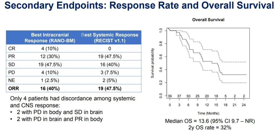 RANO-BM标准评估的颅内ORR为40%。4名(10%)患者获得完全缓解,47.5%的患者病情稳定(SD)。根据RECIST v1.1评估的全身ORR为47.5%,全部为部分缓解(PR),40%患者出现SD。只有4名患者全身和中枢神经系统反应不一致,其中2名患者出血全身疾病进展和脑部SD,2名患者脑部疾病进展和全身PR。